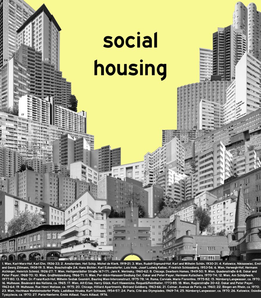 a tribute one of the best ideas of urbanism: social housing. inspired by collages from the 1920s, the poster features 27 examples of social housing from the 1900s to the 1980s; from poland, austria, france, the USA and many more countries.