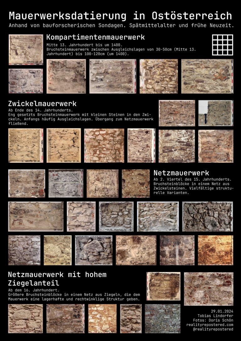 you would hardly believe how much masonry can tell if you “read” it carefully. as a member of a team of building researchers, i have learned to date and interpret masonry in recent years and me and my colleague doris schön (to whom i owe my thanks) have taken many photos of masonry probes on historic buildings during our projects. these show different stages in the development of masonry, which have been well researched for eastern austria in recent decades. due to the difficulty of translating the technical terms, i have left this poster in the original language of research, german.