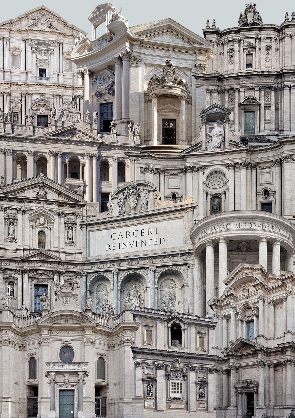 inspired by giovanni battista piranesi’s “carceri d’invenzione” (a series of bizarre etchings from ca. 1750), this collage rearranges roman renaissance and baroque buildings to a fantastic mega-architecture. try to find s. agnese in agone, s. andrea al quirinale, s. andrea della valle, s. carlo alle quattro fontane, s. croce in gerusalemme, the fontana del mosè, s. giovanni in laterano, ss. luca e martina, s. marcello al corso, s. maria in campitelli, s. maria maggiore, s. maria della pace, the palazzo lateranense, s. susanna, and–outside of rome–the graz mausoleum.